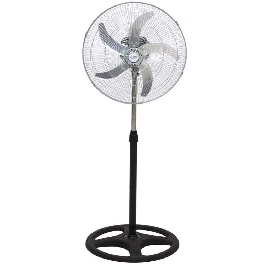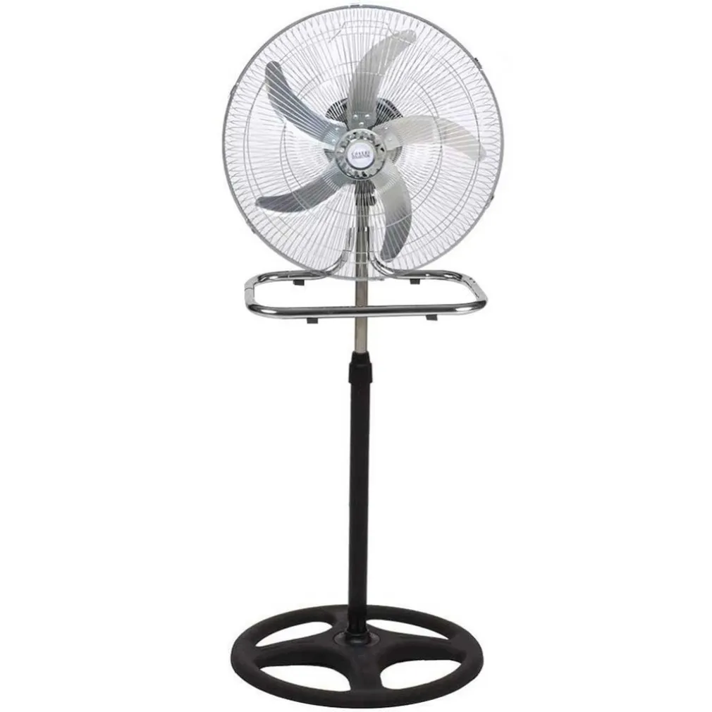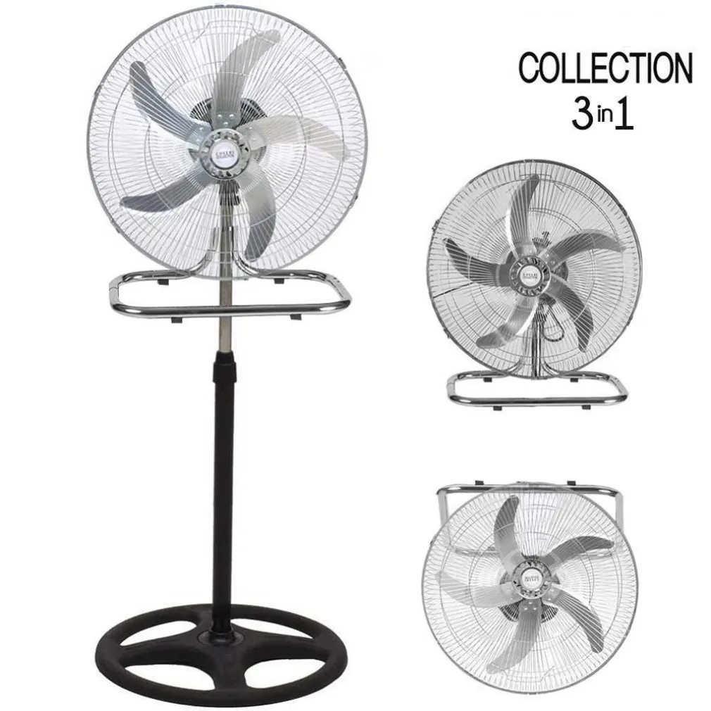 Questo incredibile ventilatore può trasformarsi in maniera facile e veloce in 3 ventilatori diversi. Ventilatore da terra a piantana con asta regolabile in altezza fino a 125 cm, ventilatore da parete grazie al pratico supporto da muro in acciaio ed infine in ventilatore da tavolo grazie alla comoda base in acciaio. Dotato di una potenza di ben 50 W con 3 velocità regolabili, 5 Pale in alluminio da 50 cm, ampia base da 50 cm in plastica dura anti ribaltamento, griglia di protezione in acciaio e oscillazione automatica per distribuire il getto d’aria in maniera omogenea in tutta la stanza. Realizzato interamente in alluminio acciaio e plastica dal design semplice e moderno questo ventilatore soddisferà ogni tua esigenza di spazio grazie alla sua funzione di 3 in 1.