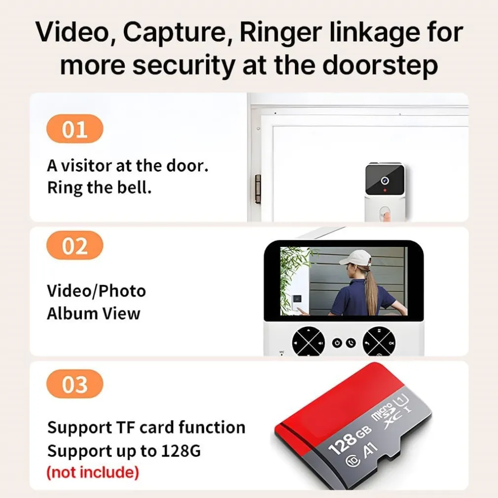 Il kit comprende tutto il necessario per l’installazione: videocitofono, monitor, cavo di ricarica, viti, adesivo e manuale. La scheda TF non è inclusa ma può essere acquistata separatamente (max. 128 GB).