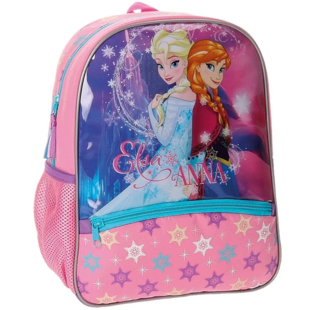Piccolo e capiente zainetto scuola per bambine con protagoniste le splendide sorelle Elsa e Anna di Frozen. Lo zaino è dotato di un ampio scomparto principale con chiusura a zip, taschino laterale e tasca frontale inferiore per conservare la bottiglietta d’acqua, piccoli accessori e la merenda. Gli spallacci sono imbottiti ed ergonomici per adattarsi perfettamente alle spalle riducendo il peso del contenuto. Lo zaino è interamente realizzato in poliestere e microfibra con una stampa di alta qualità posta sulla parte anteriore.