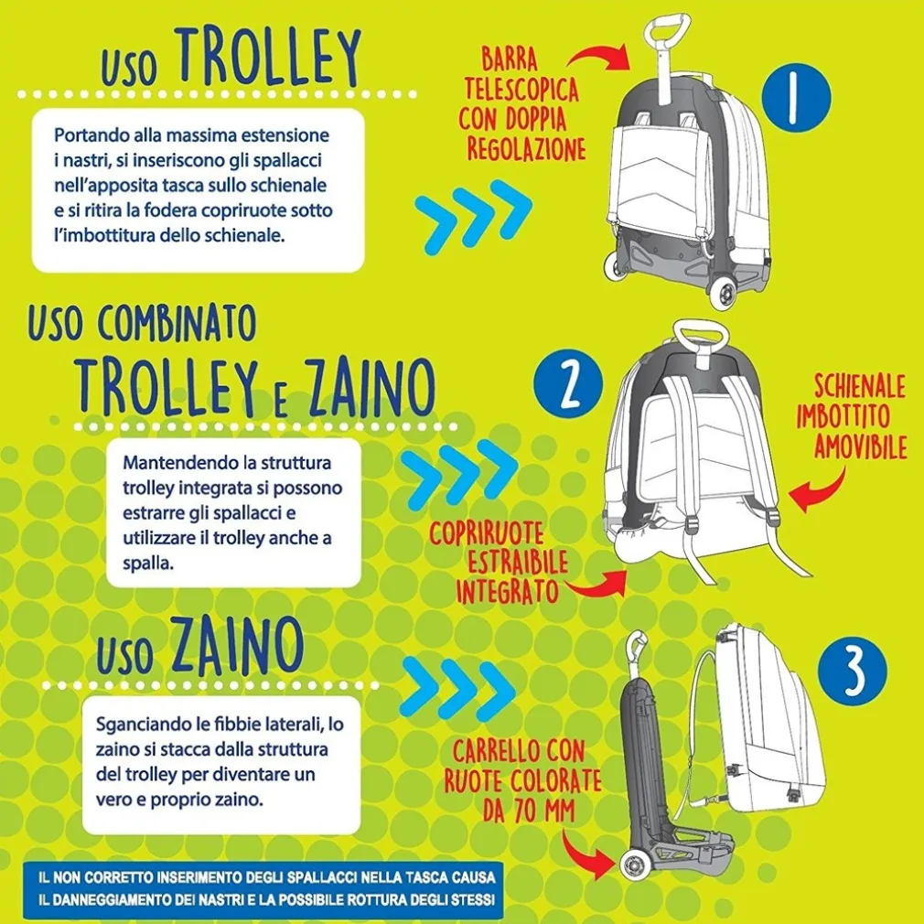 3) uso trolley con spallacci a scomparsa totale nello schienale.